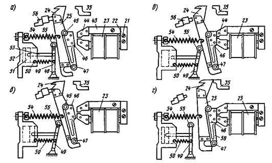 Первая стадия включения быстродействующего выключателя состоит в том, что контактный рычаг 25, не отрываясь от верхнего упора 56 (рис. 193, а), начинает вращаться под действием включающего рычага 49 вокруг оси 45 до соприкосновения его нижнего выреза с втулкой оси 47 (рис. 193,6). При дальнейшем движении контактный рычаг отходит от упора 56 (рис. 193, в) и движется вместе с якорем 46 до соприкосновения якоря с полюсами 44, натягивая при этом отключающие пружины 54. В этом положении главные контакты 24 и 35 остаются разомкнутыми.