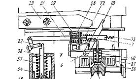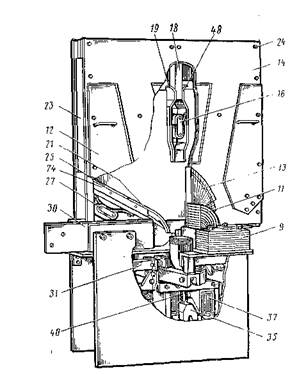 При движении дуги вверх она охлаждается боковыми стенками, а также дополнительными вертикальными перегородками 39, расчленяющими ее на параллельные дуги, что также способствует ее лучшему охлаждению. Перегородки скреплены прокладками 20. Бруски 74, на которые помещены рога, изготовлены из микоплакса (спрессованный порошок слюды со связующим). Дугогасительная камера помещается между башмаками 13 так, что они соприкасаются со стенками 14 этой камеры. Дополнительным креплением камеры служат пружинящие пластины 38.
