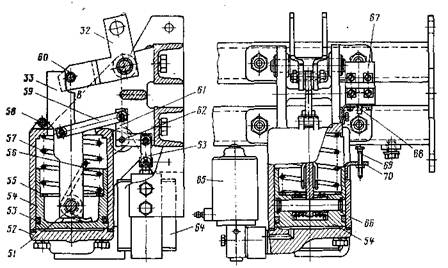 В выключателе имеется механизм, состоящий из тяги 59, рычага 61, свободно посаженного на ось 62, тяги 63, соединенной с плунжером электромагнита 64. При возбуждении этого электромагнита шток 33 поворачивается по часовой стрелке и верхней частью прижимается к ролику 60 рычага 32.
