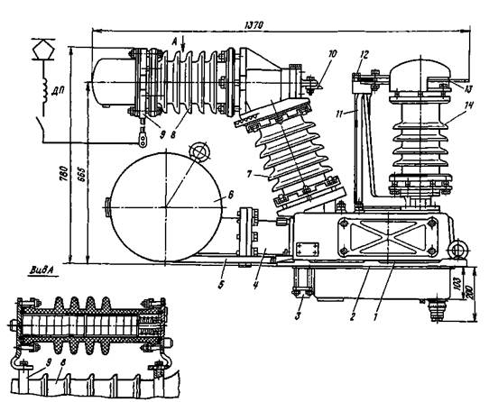 Рис. Быстродействующий выключатель 12НС и его габаритные размеры