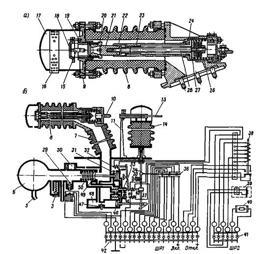Рис. Дугогасительная камера (а) и принципиальная схема (б) главного выключателя ВОВ-25-МУХЛ1.