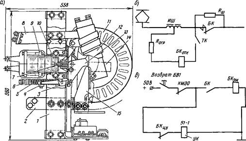 Рис. Быстродействующий контактор КМБ-3 (а), его магнитопровод (б) и схема привода (в)