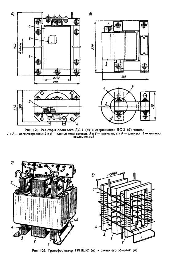 Катушки реакторов имеют одно- или двухслойные обмотки, намотанные на ребро (ДС-1 и др., провод ПСД 4,4 х ХЮ,8) или плашмя (ДС-3 и др., провод ПСД 3,53x4,7). Цилиндры катушек обычно выполняют из стеклопластика, изоляцию обмотки — из стеклянной ленты ЛЭС 0,2x35. Катушки пропитывают в лаке.