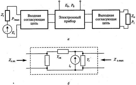 Назначение электрических цепей состоит в согласовании входного и выходного сопротивлений электронного прибора соответственно с источником возбуждения и нагрузкой и в фильтрации высших гармоник сигнала. Электронный прибор может быть представлен в виде генератора тока