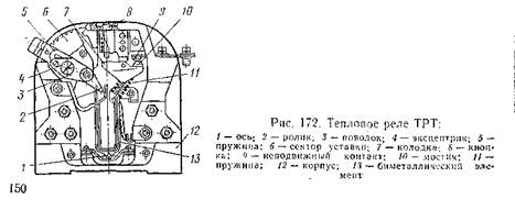 Конструкция. Тепловое реле ТРТ представлено на рис. 172. Биметаллические пластины 13 имеют U-образную форму и по ажены на ось 1. На правый конец пластины опирается цилиндрическая пружина 11, другой конец которой опирается на изоляционную колодку, несущую на себе подвижной контактный мостик 10 с серебряными контактами. Левый конец пластины соединен с механизмом уставки 2, 3, 4, 5, 6, позволяющим регулировать ток срабатывания путем изменения натяга биметаллических пластин. При достижении тока срабатывания термобпметаллические пластины изгибаются настолько, что поворачивают пружину 11, изменяется направление усилия на колодку 7, колодка поворачивается вокруг оси / и отключает контакт. Спустя 1—2 мин пластины остывают, занимают первоначальное положение и реле самовосстанавливается.
