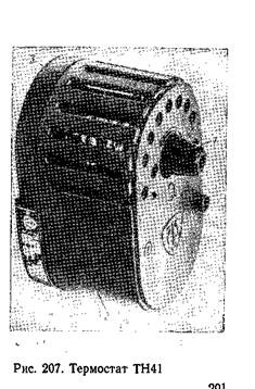 Термостат ТН41 (рис. 207) состоит из биметаллической полосы. Один конец ее укреплен неподвижно, а на другом конце имеется стальной якорь с подвижным кон-гактом. Против якоря помещен постоянный магнит. Нормально якорь притянут к магниту и контакты термостата замкнуты. При повышении температуры окружающего воздуха и нагревании биметаллической полосы создается усилие, стремящееся оторвать якорь от магнита. Когда это уси-лие становится больше усилия магнита, якорь мгновенно отходит от магнита и контакты размыкаются. При понижении температуры биметаллическая полоса прогибается в обратную сторону, и когда сила магнита оказывается 1ольше силы, поворачивающей