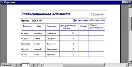 Отчеты. Предназначены для вывода данных на печатающее устройство. В них приняты специальные меры для группирования выводимых данных и для вывода специальных элементов оформления, характерных для печатных документов (верхний и нижний колонтитулы, номера страниц и т.п.)