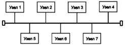 Шинная топология – одна из наиболее простых. Она связана с использованием в качестве передающей среды коаксиального кабеля. Данные от передающего узла сети распространяются по шине в обе стороны. Промежуточные узлы не транслируют поступающих сообщений. Информация поступает на все узлы, но принимает сообщение только тот, которому оно адресовано. Дисциплина обслуживания параллельная.