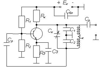 Транзисторный диапазонный АГ собран по трёхточечной схеме с ёмкостной ОС, с комбинированным напряжением смещения на базе, с параллельной схемой питания коллектора, неполным включением контура в цепь нагрузки.