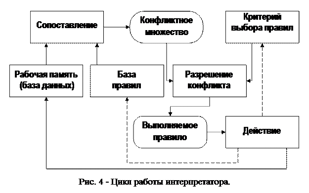 В одном цикле может сработать только одно правило. Если несколько правил успешно сопоставлены с фактами, то интерпретатор производит выбор по определенному критерию единственного правила, которое срабатывает в данном цикле. Цикл работы интерпретатора схематически представлен на рис. 4.
