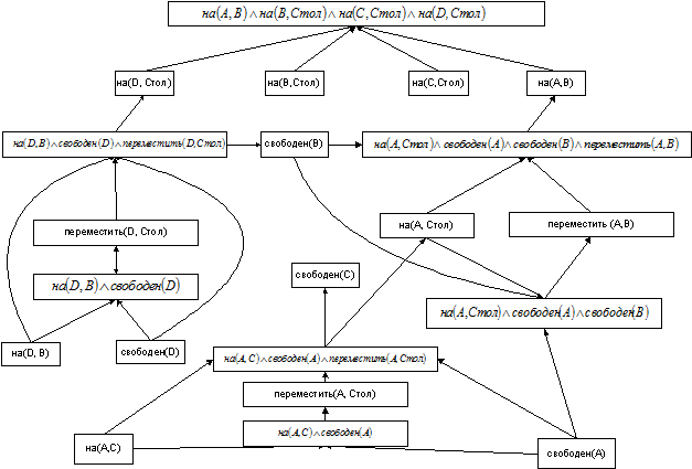 В результате кубики А и D оказались на столе. Кубики С и В никуда не перемещались и, согласно начальному состоянию, остались на столе. Используя формулу (4.137), получим унифицированную формулу