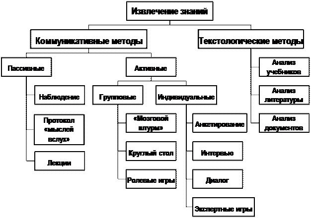 Коммуникативные методы извлечения знаний охватывают методы и процедуры контактов инженера по знаниям с непосредственным источником знаний — экспертом, а текстологические включают методы извлечения знаний из документов (методик, пособий, руководств) и специальной литературы (статей, монографий, учебников).