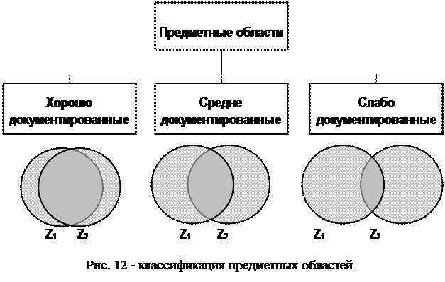 Эта классификация связана с соотношением двух типов знаний Z1 и Z2, где Z1 — это экспертное «личное» знание, а Z2 — материализованное в книгах «общее» знание в данной конкретной области. Если представить знания Zпо предметной области как объединение Z1 и Z2, то есть Zпо = Z1Е Z2, то рис. 12 наглядно иллюстрирует предложенную классификацию.