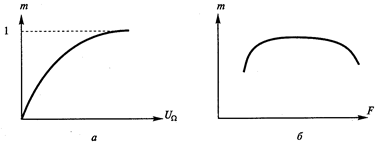 Динамические характеристики при АМ: модуляционная m=Ф(UW) (а) и модуляционно-частотная m=Ф(W) (б), где UW, W - амплитуда и частота модулирующего сигнала.