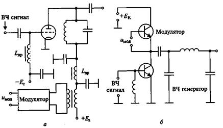 Схемы соединения модулируемого каскада (ВЧ генератора) и амплитудного модулятора при анодной и коллекторной модуляции приведены на рисунке.