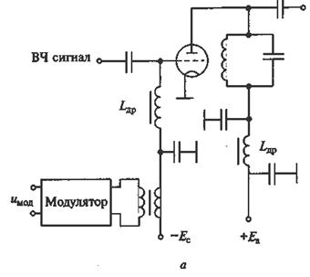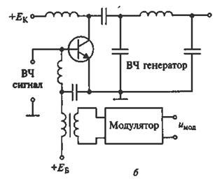 Схемы соединения модулируемого каскада (ВЧ генератора) и амплитудного модулятора с помощью трансформатора при сеточной и базовой модуляции приведены на рисунке