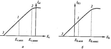 На характеристиках точке 1 соответствует режим молчания или несущей, точке 2 - максимальный, точке 3 - минимальный режим. Чем меньше графики модуляционных характеристик Ial(Ес) и IК1(ЕБ) отклоняются от прямой линии, тем меньше уровень нелинейных искажений передаваемого сообщения за счет амплитудной модуляции. Для получения линейности этих графиков точка 2 на них должна соответствовать граничному режиму работу, а все остальные - недонапряженному. При этом КПД генератора на протяжении всей характеристики меняется по линейному закону, уменьшаясь начиная с точки 2.