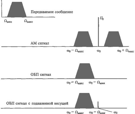 – ширина спектра ОБП сигнала уже полосы спектра AM сигнала в два раза, что позволяет сузить полосу пропускания радиоприемника по промежуточной частоте и получить выигрыш в отношении сигнал-помеха по мощности также в два раза (мощность шумов в радиоприемнике пропорциональна его полосе пропускания по промежуточной частоте);