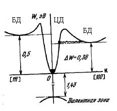 Большинство электронов при нормальной температуре занимают центральную долину (ЦД). m*=0,066m, большая подвижность μ=(6…9)×103 см2/(В×с). В боковой долине (БД) m*=0,85m, μ=(0,1…0,15)×103 см2/(В×с).