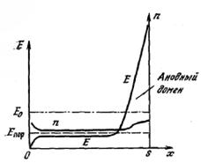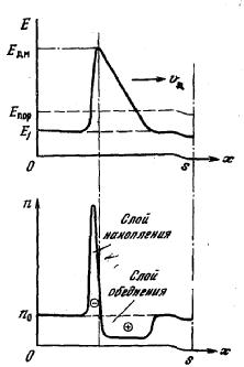 Увеличение сопротивления в этой области приводит к перераспределению падения напряжения вдоль полупроводника. В этой области падение напряжения увеличивается, в остальных участках напряжённость поля падает и становится ниже критического.