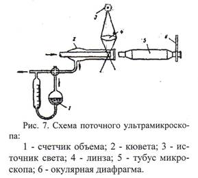 Б. В. Дерягин и Г. Я. Власенко сконструировали специальный поточный ультрамикроскоп, с помощью которого весьма быстро можно определить число частиц в единице объема аэрозоля или лиозоля. Схематическое устройство поточного микроскопа показано на рис. 7. Изучаемый лиозоль или аэрозоль наблюдается в потоке, направленном вдоль канала кюветы 2, параллельного оси тубуса микроскопа 5. Каждая частица, пересекая зону, освещенную источником света 3, дает вспышку; общее число таких вспышек может быть легко подсчитано наблюдателем. Разделив число подсчитанных вспышек на измеряемый счетчиком 1 общий объем аэрозоля, протекающего через контролируемую и вырезанную окулярной диафрагмой 6 часть поля, легко найти численную концентрацию При таком методе определении численной концентрации отпадают почти все источники ошибок, возможные при классическом ультрамикроскопическом методе счета, и, кроме того, значительно сокращается время исследования. Так, при определении очень малых концентраций аэрозоля, остающегося после просасывания через аэрозольные фильтры, поточным методом время измерения сокращается в 100 и более раз при одновременном повышении точности определения.