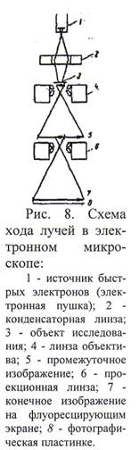 Ход электронного пучка в электронном микроскопе изображен на рис. 8. В общем, он сходен с ходом световых лучей в обычном микроскопе. Однако поскольку электроны легко рассеиваются и поглощаются, для фокусировки пучка электронов применяют электромагнитные катушки, создающие электростатические или магнитные поля. Для уменьшения рассеяния электронов внутри электронного микроскопа поддерживают высокий вакуум. Наконец, с той же целью для исследования применяют объекты очень малой толщины, нанесенные обычно на тончайшую нитроцеллюлозную, кварцевую, углеродную или другие пленки, прозрачные для пучка электронов. Если последнее условие не будет соблюдено, то под воздействием электронов может происходить нагревание и разрушение объекта. Очень часто вместо самих объектов в электронном микроскопе наблюдают их отпечатки на различных пленках. Такие пленки - отпечатки (реплики) для придания им большей контрастности обычно оттеняют с помощью напыления каким-нибудь молекулярно-раздробленным металлом (например, хромом).