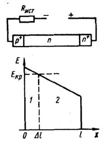На границе р+-п образуется участок 1 длиной ∆l повышенной напряженности поля Е > Екр (область лавины) и участок 2 длиной l — ∆l, где Е < Eкр (область дрейфа, или пролетная область).