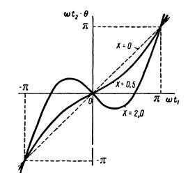 Чем больше величина X, тем сильнее график фазы прибытия отклоняется от прямой линии. Обращает на себя внимание факт, что при определенной величине параметра X возможна неоднозначность зависимости t1 = f(t2).