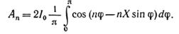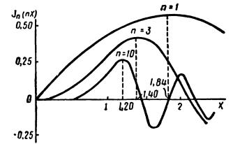 Остается рассмотреть еще один множитель — величину Jn(nX). На рисунке построены графики бесселевых функций Jn(nX) для трех значений п.