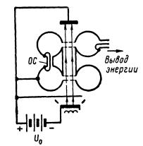 Устройство двухрезонаторного клистронного генератора схематически показано на рисунке.