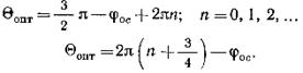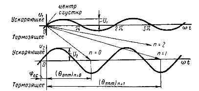 На рисунке построены графики напряжений на входном и выходном зазорах клистрона; через φoc обозначен сдвиг фаз, определяемый устройством обратной связи. Электронные сгустки образуются относительно электронов, прошедших центр первого зазора в момент перехода поля от тормозящего к ускоряющему. Для отдачи максимальной энергии сгустки должны проходить выходной зазор в момент максимального тормозящего поля. Из рисунка видно, что оптимальный угол пролета в пространстве дрейфа должен составлять