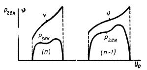 Таким образом, при изменении напряжения U0 должен наблюдаться ряд дискретных зон генерации, соответствующих целочисленным значениям п. В промежутках между зонами генерируемая мощность падает до нуля. Электронные сгустки попадают в этом случае в выходной зазор клистрона в моменты ускоряющего высокочастотного поля.