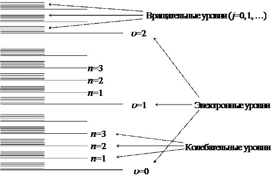 Здесь Eэл – энергия электронов, Eкол – энергия колебаний ядер (подразумевается колебательное отклонение ядер от равновесного положения при неподвижном центре масс молекулы), Eвращ – энергия вращения молекулы как целого. Существенно, что Eэл >> Eкол >> Eвращ. Такое соотношение определяет своеобразную структуру энергетических уровней молекулы. Каждый электронный уровень, который мы будем обозначать квантовым числом u =0, 1, …, сопровождается своим набором колебательных уровней, квантовые числа n =0, 1, …, а те, в свою очередь, имеют вращательную структуру, квантовые числа j =0, 1, …. Схема энергетических уровней молекулы показана на рис. 1.