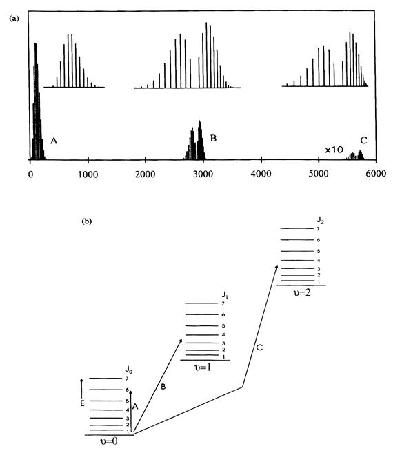 Пример колебательно-вращательного спектра газа 1H35Cl в основном электронном состоянии (u =0) приведен на рис. 2. (a) (см. [[1]]). Здесь по горизонтальной оси отложено волновое число (волновое число определяется как единица, деленная на длину волны в сантиметрах). На рис. 2. (b) изображена схема энергетических уровней и переходов, соответствующих колебательно-вращательным линиям рис. 2. (a). Серия линий A является чисто вращательной – она возникает благодаря только переходам между вращательными уровнями основного колебательного состояния (n =0). Переходы с уровня n =0 на уровни n =1 и n =2 ответственны за линии B и C. Чисто колебательные переходы, когда вращательное квантовое число не изменяется (D j =0), для молекул HCl запрещены правилами отбора. Поэтому в сериях B и C отсутствуют центральные линии. В случае, когда вращательная степень свободы отсутствует (например, для молекул в матрицах), отсутствует и серия A, а вместо серий B и С имеют место одиночные линии на месте «пропущенных» центральных линий, соответствующие переходам n =0→ n =1 и n =0→ n =2 соответственно. Переходы с нулевого на первый колебательный уровень (B) называются основным тоном или первой гармоникой, переходы с нулевого на второй (C) – первым обертоном (или второй гармоникой) и т.д. Конечно, возможны переходы n =0→ n =3 – второй обертон (третья гармоника), n =0→ n =4 – третий обертон (четвертая гармоника) и т.д. Однако интенсивности соответствующих им линий низки и данные линии на рис. 2 не отображены.