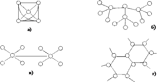 | Рис. 3.5. Топологии сетей связи: а) схема связи «каждый с каждым»; б) радиальная; в) радиально-узловая; г) ячеистая |