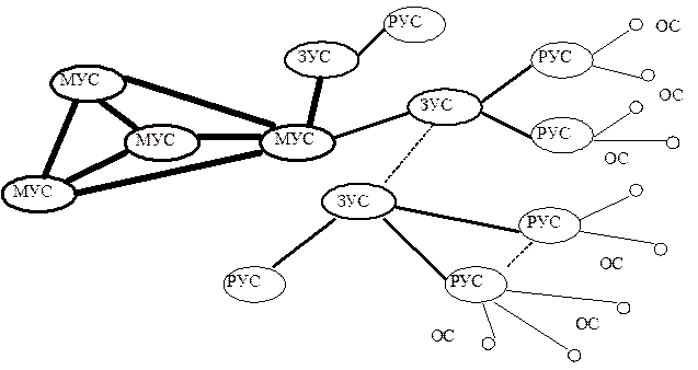 | Рис. 3.6. Архитектура Единой сети электросвязи (ЕСЭ): МУС – магистральные узлы связи; ЗУС – зональные узлы; РУС – районные узлы; ОС – отделения связи в населенных пунктах; |