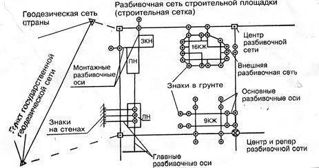 из разбивочной сети, внешней сети и разбивочных осей — для крупных и сложных объектов, а также для зданий выше 9 этажей;