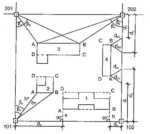 Перенесение точек А и В осуществляют способом прямоугольных координат или перпендикуляров (здание 1), полярных координат (здание 2), угловых засечек (здание 3) и линейных засечек (здание 4).