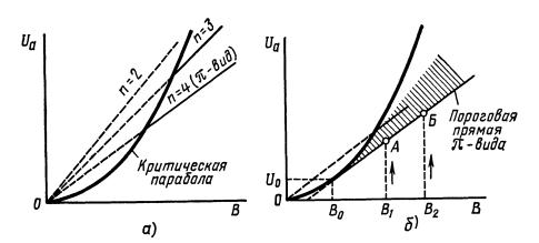 Согласно этому уравнению анодное напряжение, при котором должно происходить самовозбуждение многорезонаторного магнетрона, для каждого вида колебаний при фиксированном номере гармоники р линейно связано с индукцией магнитного поля. Отношение Uа/В есть величина постоянная для данного магнетрона при заданных значениях n и р.