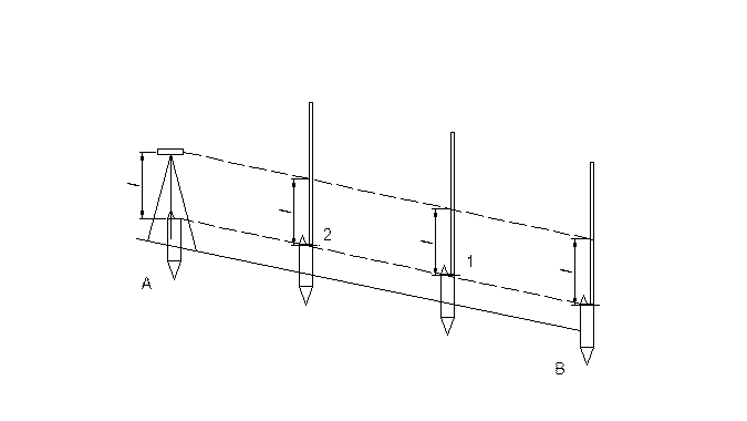 4. Последовательно перенося рейку на промежуточные точки (1,2) забивают колышки так, чтобы отсчёт по рейке в этих точках равнялся высоте прибора.