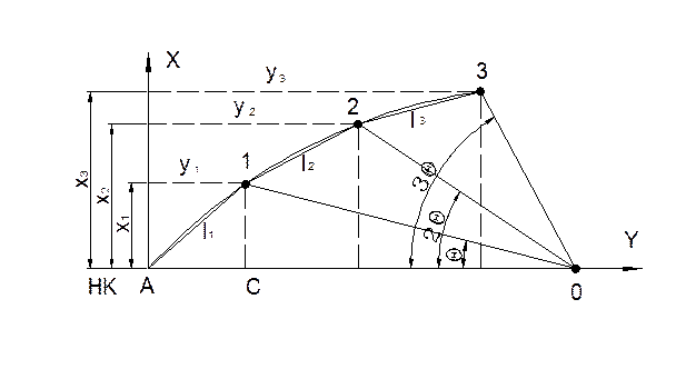 6. Определение положения точек 1,2,3 кривой на местности сводится к откладыванию рулеткой от НК (КК) отрезков X 1, X 2, X 3… y 1, y 2, y 3