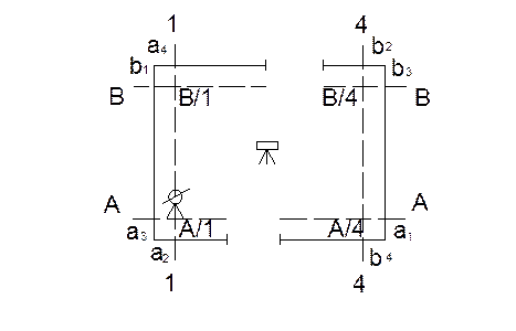 6. Теодолит перенести в точку В/4, повторить рассмотренные выше действия и найти положение точек b1, b2, b3,b4.