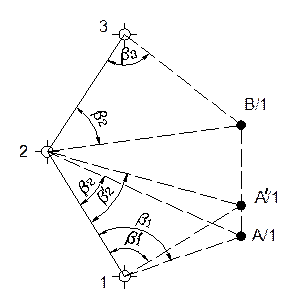 Проложим теодолитный ход. Точки 1,2,3 хода, с которых видимы точки А/1 и В/1