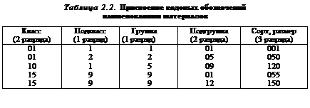 В качестве примера последовательного метода кодирования рассмотрим присвоение кодовых обозначений наименованиям материалов по укрупненной номенклатуре. Для этого материалы делят на классы, каждый класс — на подклассы, подкласс — на группы, группы — на подгруппы, а каждая подгруппа содержит определенное число наименований, сортов и размеров материалов (табл. 2.2). Например, класс — это основные и вспомогательные материалы; подкласс — это черные, цветные металлы и т. д.; группа для черных металлов — это чугун, сталь и т. д.; подгруппа для стали — круглая, листовая и т. п.; и наконец, всякий материал имеет сорт и размер.