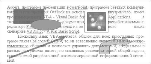 На показанном выше фрагменте страницы размещены следующие графические объекты: прямоугольник с закраской, помещенный за текстом, овал с закраской, помещенный перед текстом на переднем плане, рамка надписи с размещенным в ней рисунком и обтеканием текста вокруг рамки, закрашенные прямая и фигурная стрелки, помещенные за текстом.