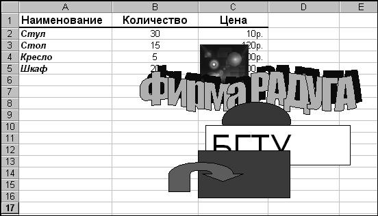 Электронные таблицы Excel также являются многослойным «пирогом», однако его структура несколько другая. Что касается графических объектов, размещаемых на листе таблицы, то практически никаких отличий от страницы документа Word нет. Объекты также могут наслаиваться друг на друга, причем этот порядок можно менять (см. рис. 1.3, где графические объекты размещены в шесть слоев друг за другом). Однако такие объекты всегда заслоняют основную информацию в ячейках таблицы и здесь нельзя графические объекты задвинуть под «текст», как это было в текстовых документах.