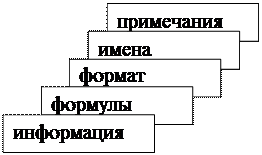 Главным звеном в электронной таблице является ячейка. Каждая ячейка таблицы Excel имеет пять уровней размещения информации, которые схематично представлены на рис. 1.4.