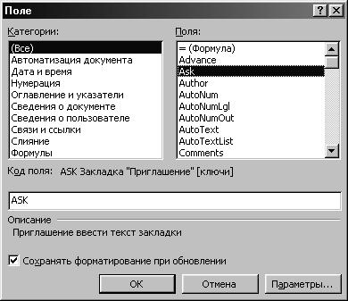 Для вставки поля в текстовый документ необходимо выполнить команду Вставка/Поле…, в диалоговом окне которой (см. рис. 2.1) выбирается из нескольких десятков возможных соответствующее поле и задаются необходимые ключи и параметры для процедуры, которая выполняется для данного поля.