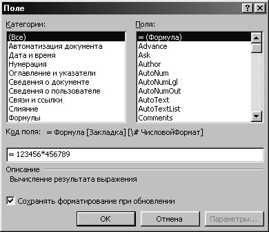 В частности, в отчетных документах можно включить поле =(Формула), которое работает в режиме калькулятора и позволяет проводить различные вычисления, не выходя из текстового документа. Предположим, что нам необходимо вычислить произведение чисел 123456 и 456789. Для этого достаточно вставить в соответствующее место текстового документа поле формулы, указав в качестве его параметра (см. рис. 2.2) произведение нужных чисел, что приведет к появлению на месте вставляемого поля результата 56393342784 (напомним, что в качестве операции умножения используется символ *, деления – символ /, возведения в степень – символ ^). Для новых вычислений в этом поле достаточно перейти от значения поля к его коду {=123456*456789 \*MERGEFORMAT} и изменить в коде после знака равенства расчетную формулу, для чего необходимо последовательно выполнить команды контекстного меню поля: Коды/значение полей и после обновления формулы – Обновить поле.