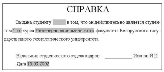 Например, для электронного варианта справки, выдаваемой в студенческом отделе кадров, можно создать шаблон документа, представленного на рис. 2.4. Первое поле созданного шаблона является текстовым, второе и третье – списками, которые необходимо после внедрения полей в шаблон заполнить, используя команду Свойства на панели Формы (см. рис. 2.5).